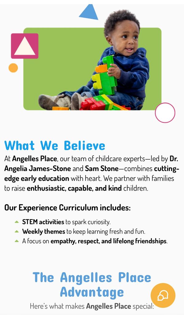 At Angelles Place Child Development Center, our mission is to provide a safe, nurturing, and engaging environment for children ages 4 weeks to 5 years to grow, learn, and thrive. We are dedicated to supporting the whole child socially, emotionally, physically, and academically through developmentally appropriate practices, loving care, and purposeful learning experiences.