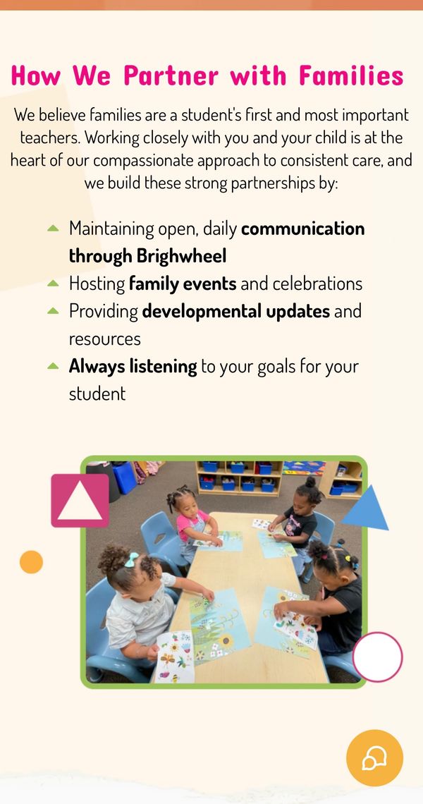 We partner with families and the community to build strong foundations for lifelong learning, encouraging curiosity, creativity, and confidence in every child. Our goal is to create a space where children feel valued, respected, and inspired to reach their fullest potential.
